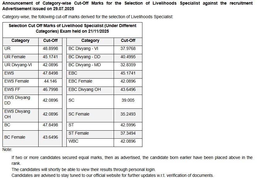- Livelihood Specialist के लिए कटऑफ काफी संतुलित रहा है।