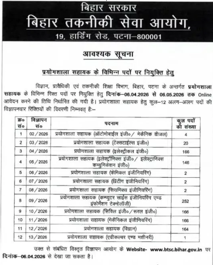 The Bihar Technical Service Commission (BTSC) has officially released a short notice for the recruitment of Laboratory Assistants for the year 2026. This is a golden opportunity for candidates with a science background or technical diploma to secure a government job in Bihar. With a total of 1091 vacancies, the commission aims to strengthen the technical departments across the state. In this article, we provide the most comprehensive details regarding the syllabus, exam pattern, salary, and step-by-step application process.